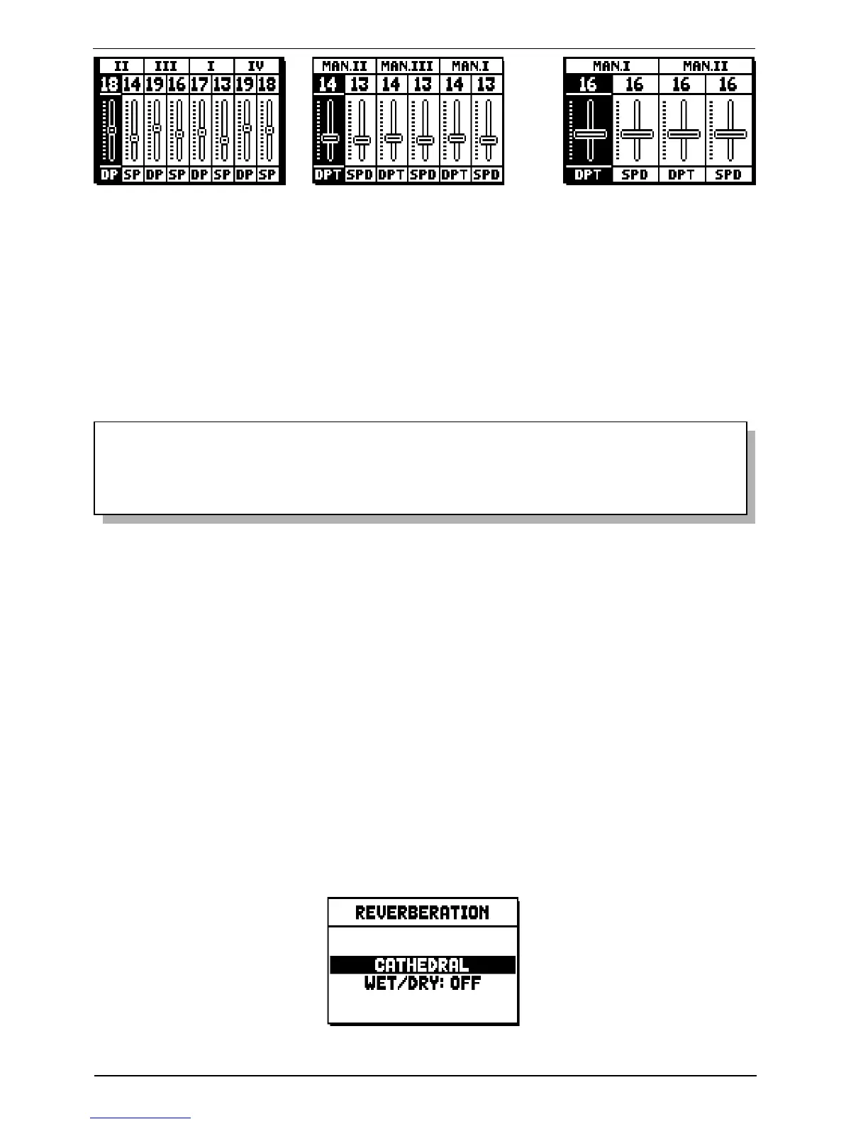 That show the current DP or DPT (depth) and SP or SPD (speed) values of the manuals’ tremulant.