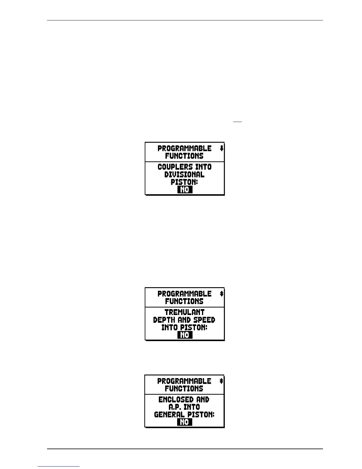 The PROG. FUNCTIONS sub-menu contains several settings related to the divisional pistons, Crescendo