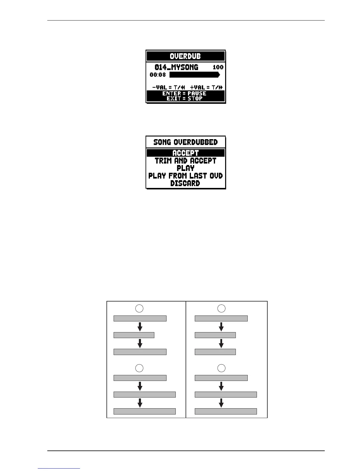 o ACCEPT: accept the overdubbing. In case the overdub track is shorter than the original piece, it will not