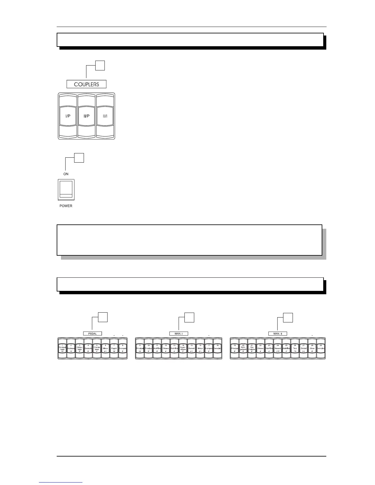 1. Koppel sectie: deze knoppen koppelen de registers van de verschillende manualen en