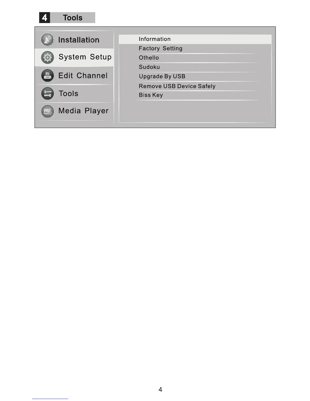 Enter the "Tools" menu to check the software version information, to revert to Factory