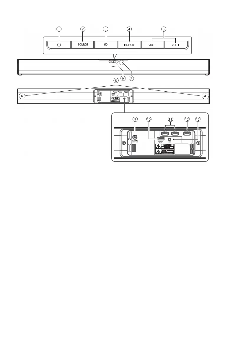 5. Knapperne VOL+/VOL-. Hvis en BT-kilde er parret og aktiv, kan volumenknapperne justere