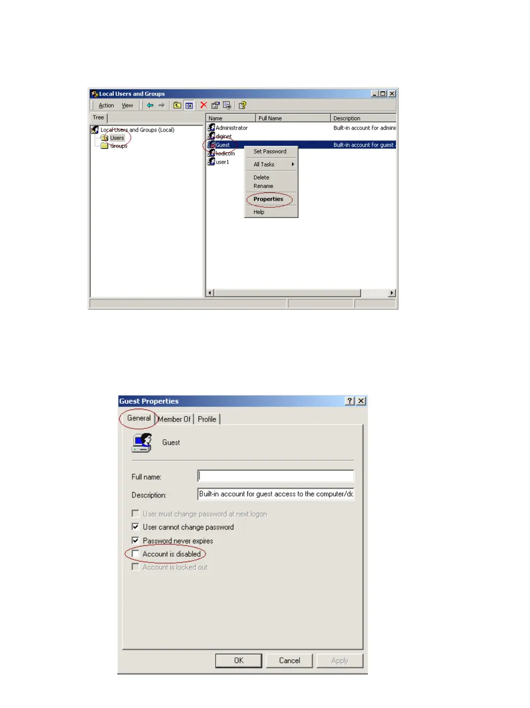 - Select “Guest” in “User” menu and select Guest “Properties” by right clicking on “Guest”.