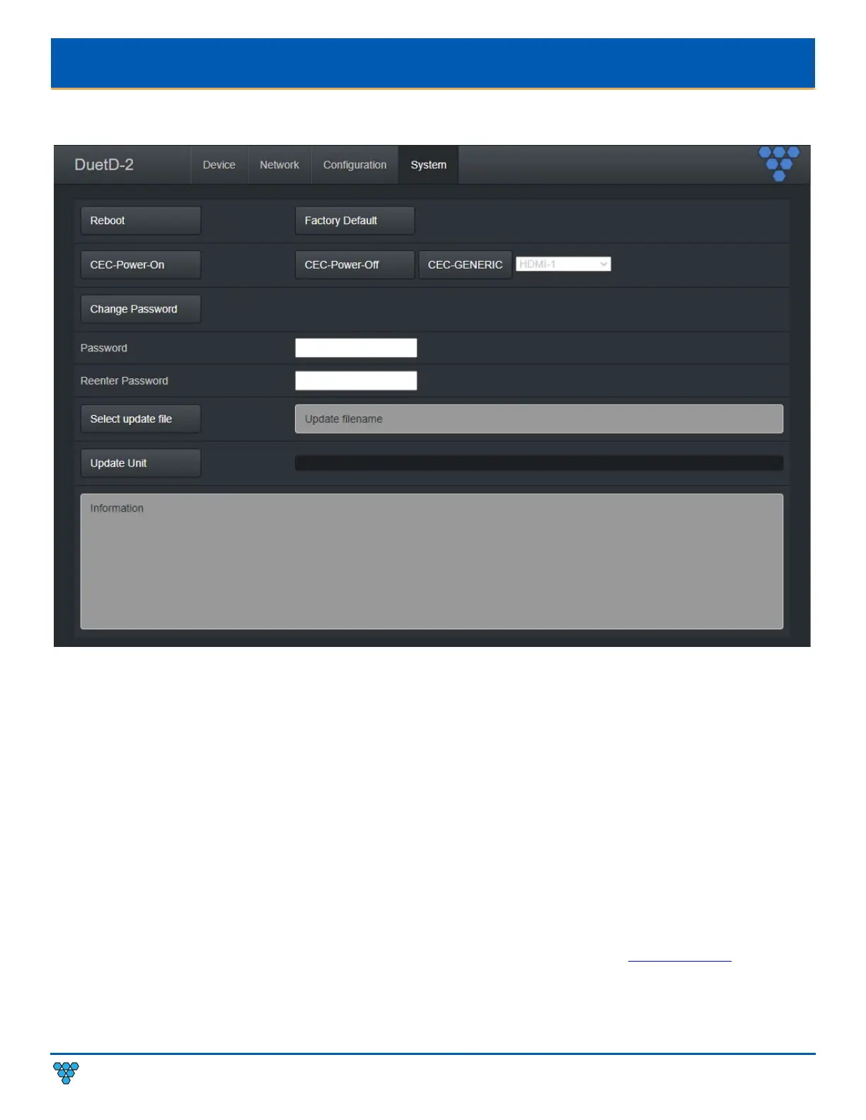 Change Password – This button changes the unit’s web interface login password to values entered below (default is admin).