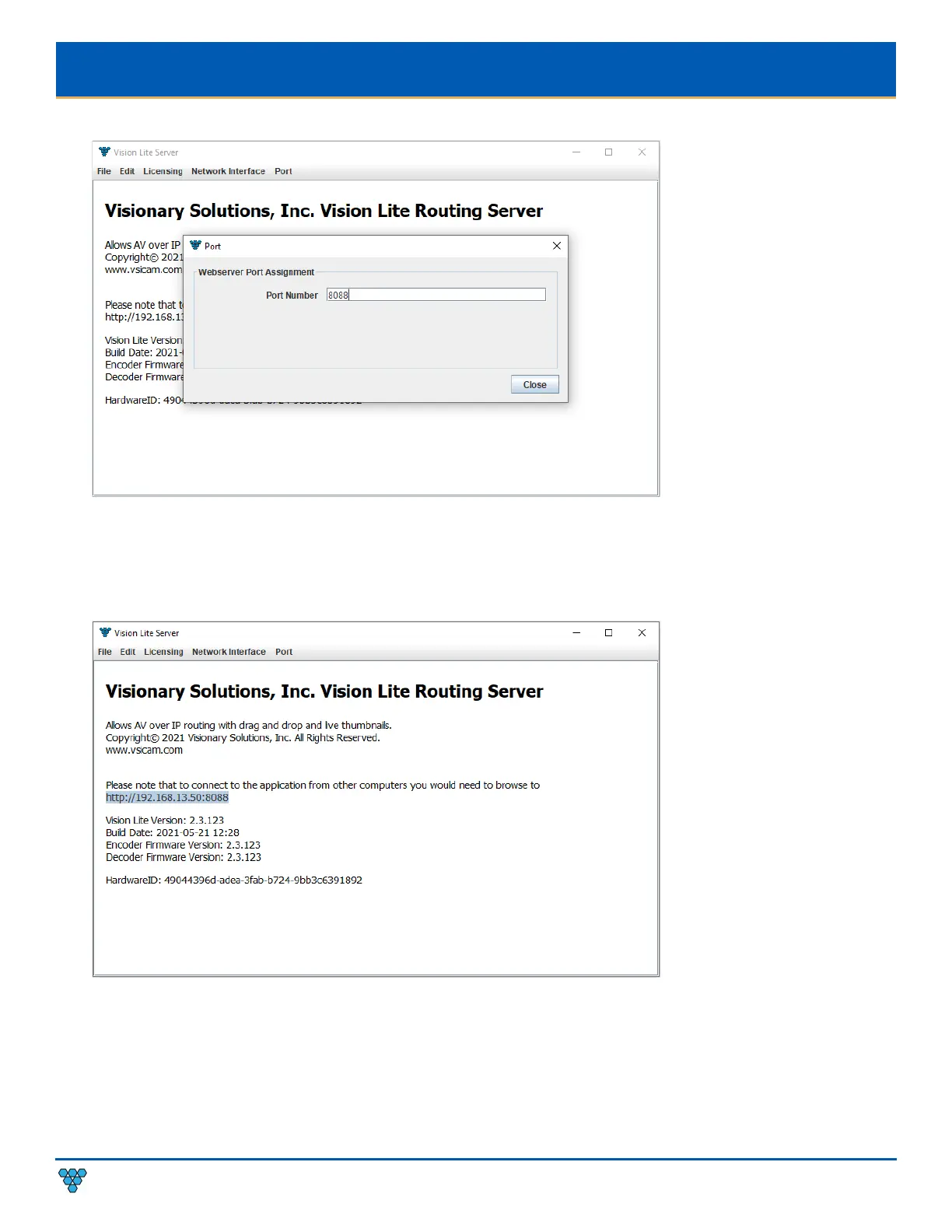 Important: The Vision Lite Server window needs to be closed and then reopened for the new port number to be assigned.