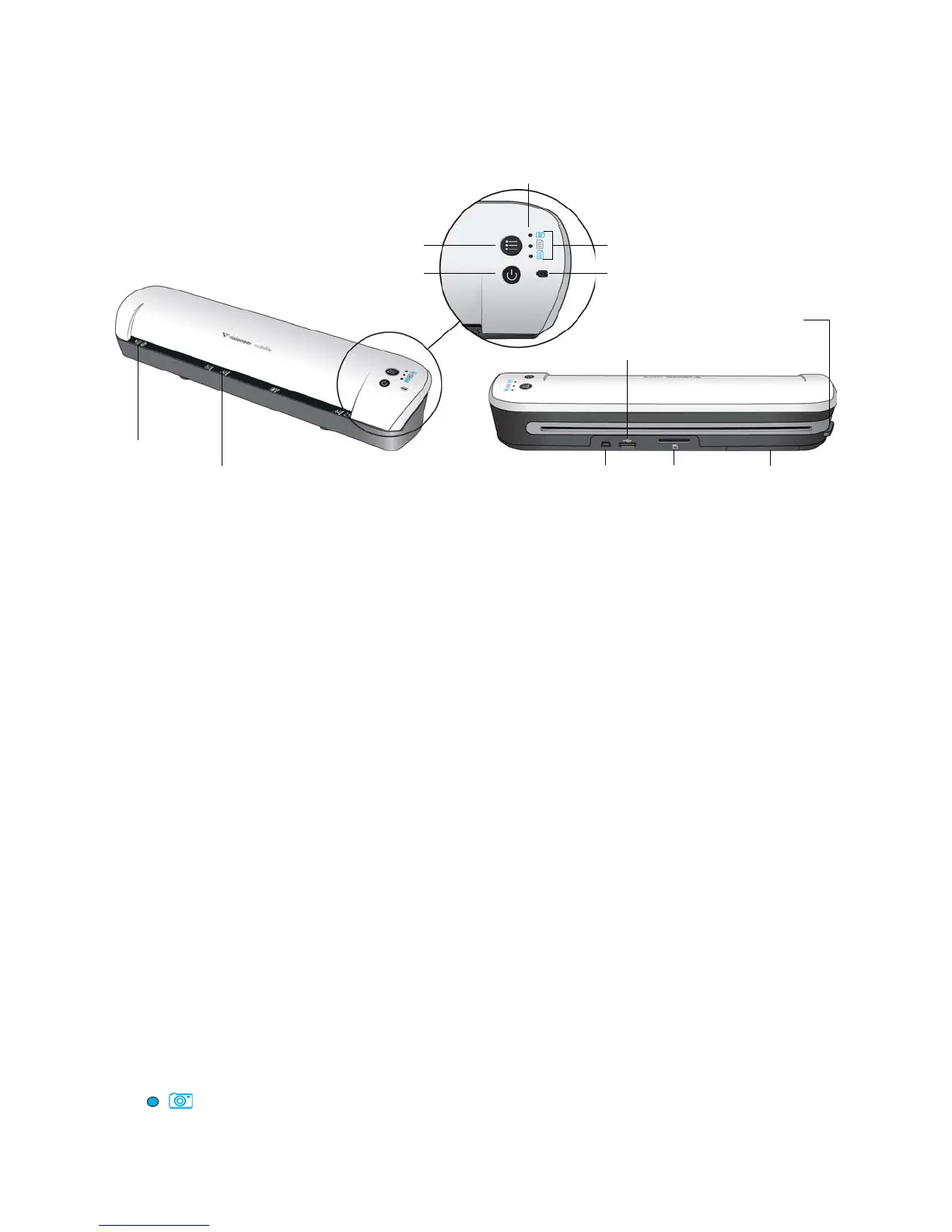 • Power button—Press, hold-down for 3 seconds, then release the power button to turn the scanner on