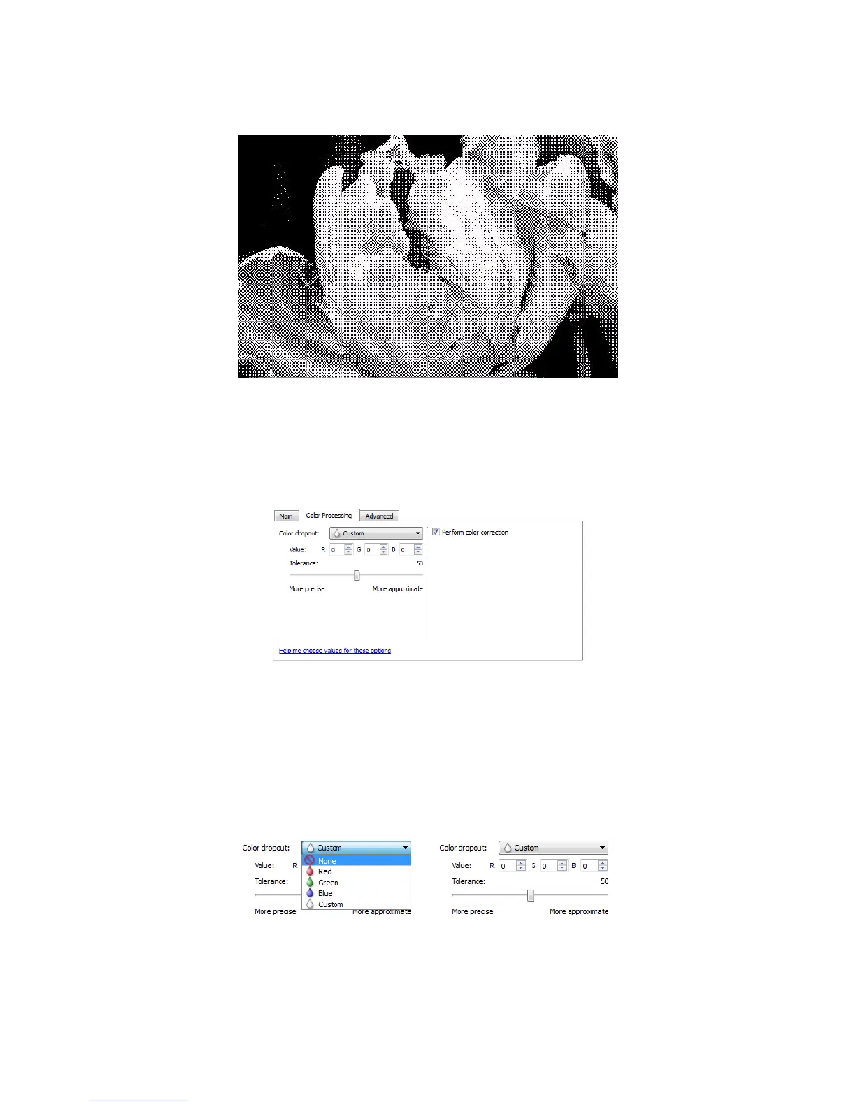 Color dropout tells the scanner and software to remove a specific color from the image. You can choose either