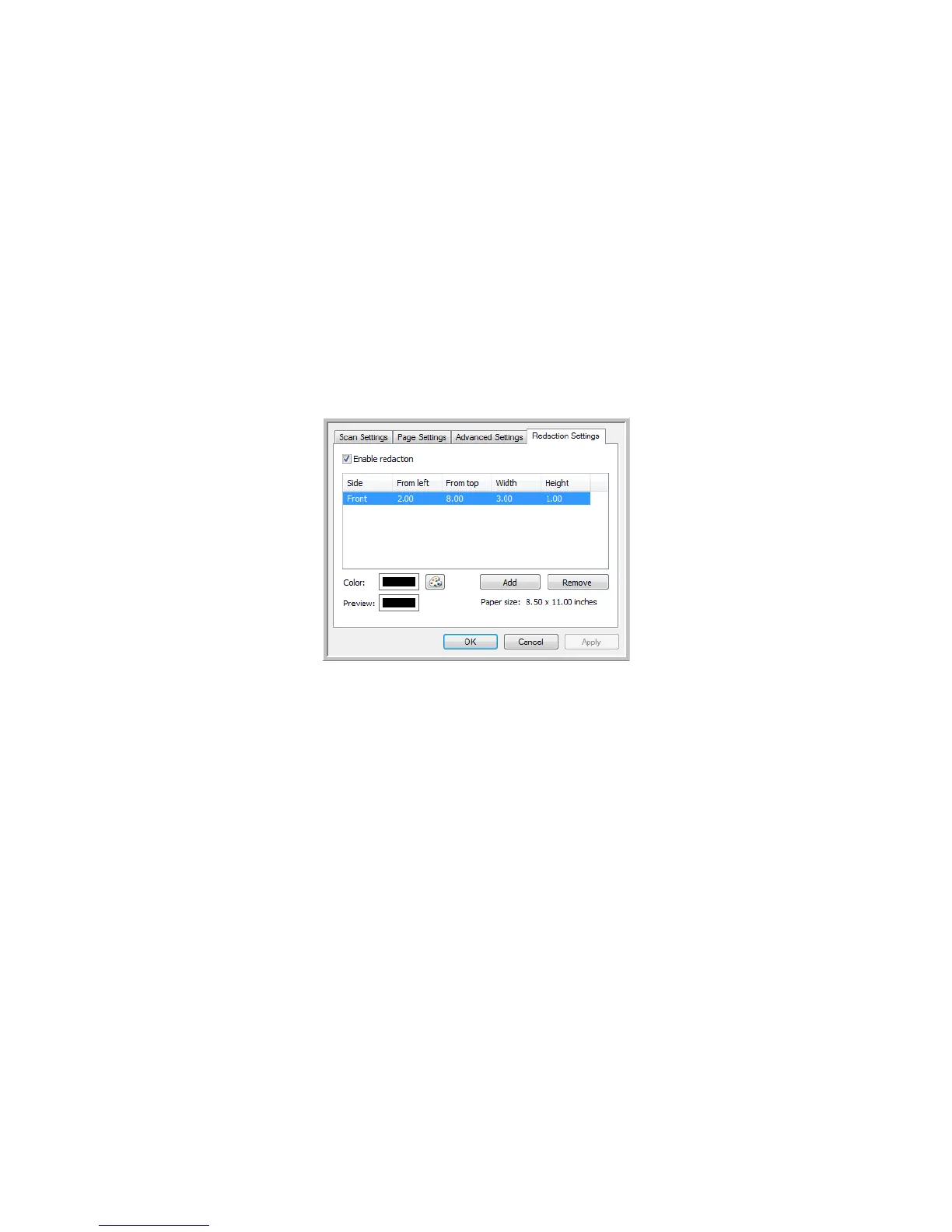 Use the options on the Redaction Settings tab to remove a specified area in the scanned image.