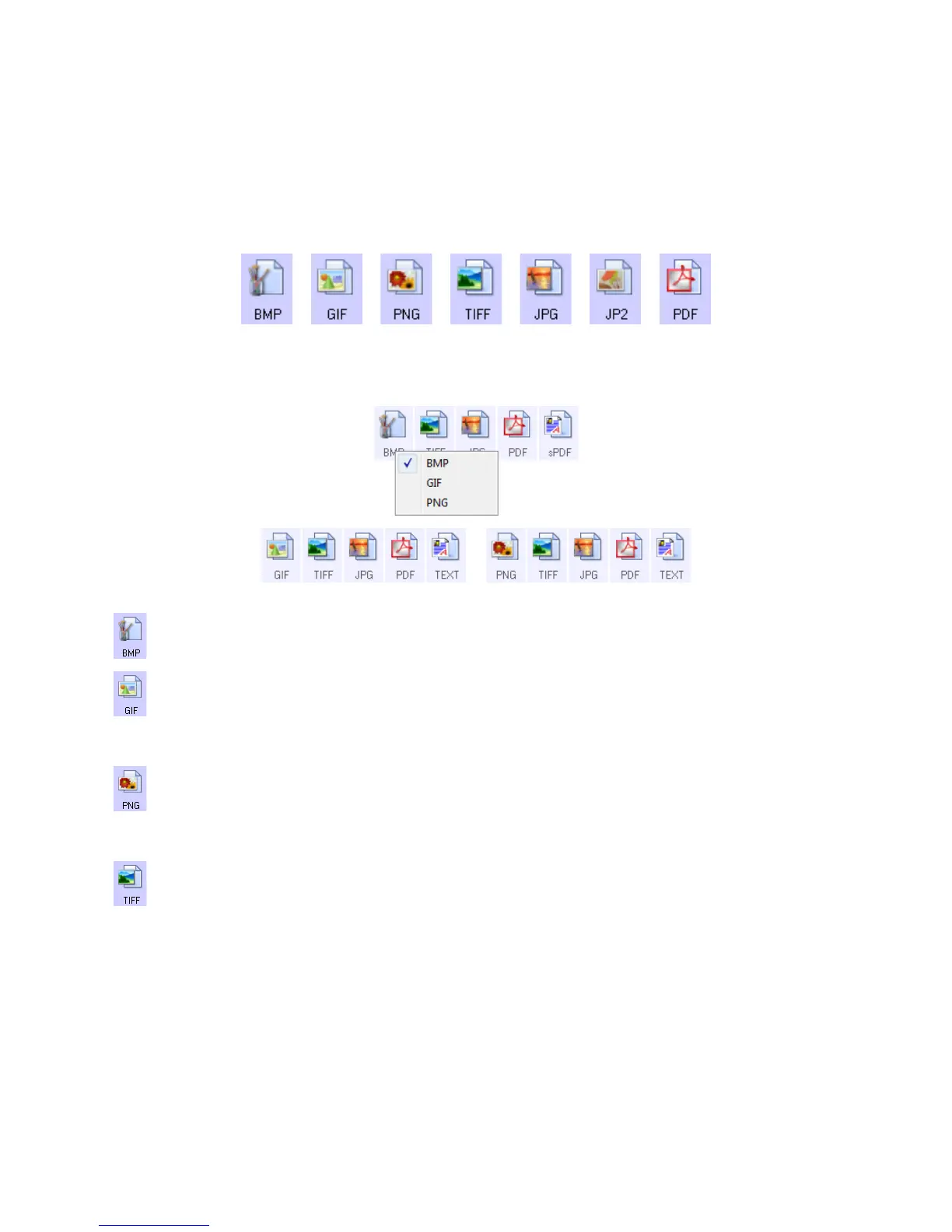 Select an image file format for photos, artwork or other documents that you want to save as images. BMP and TIFF
