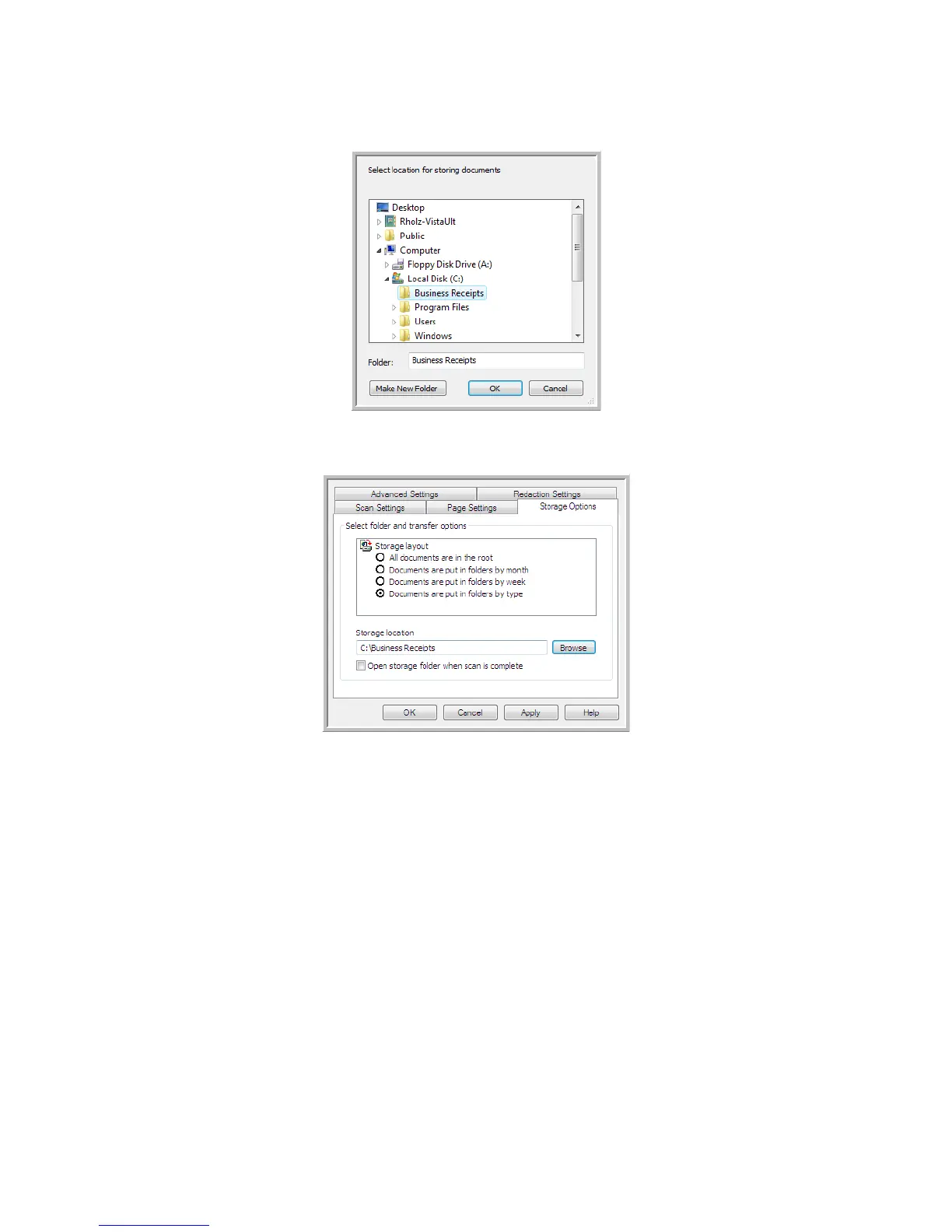 10. Click OK. The selected folder will now be set as the Storage location, such as “Business Receipts.”
