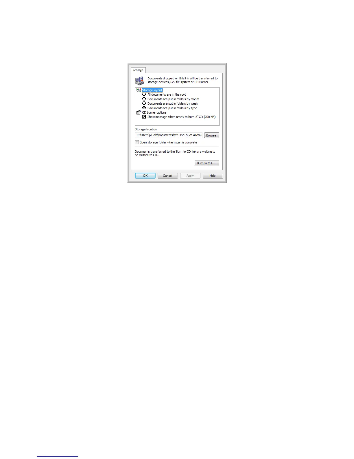 6. When you are ready to burn the files to a CD, open the OneTouch Properties window, select Burn to CD and