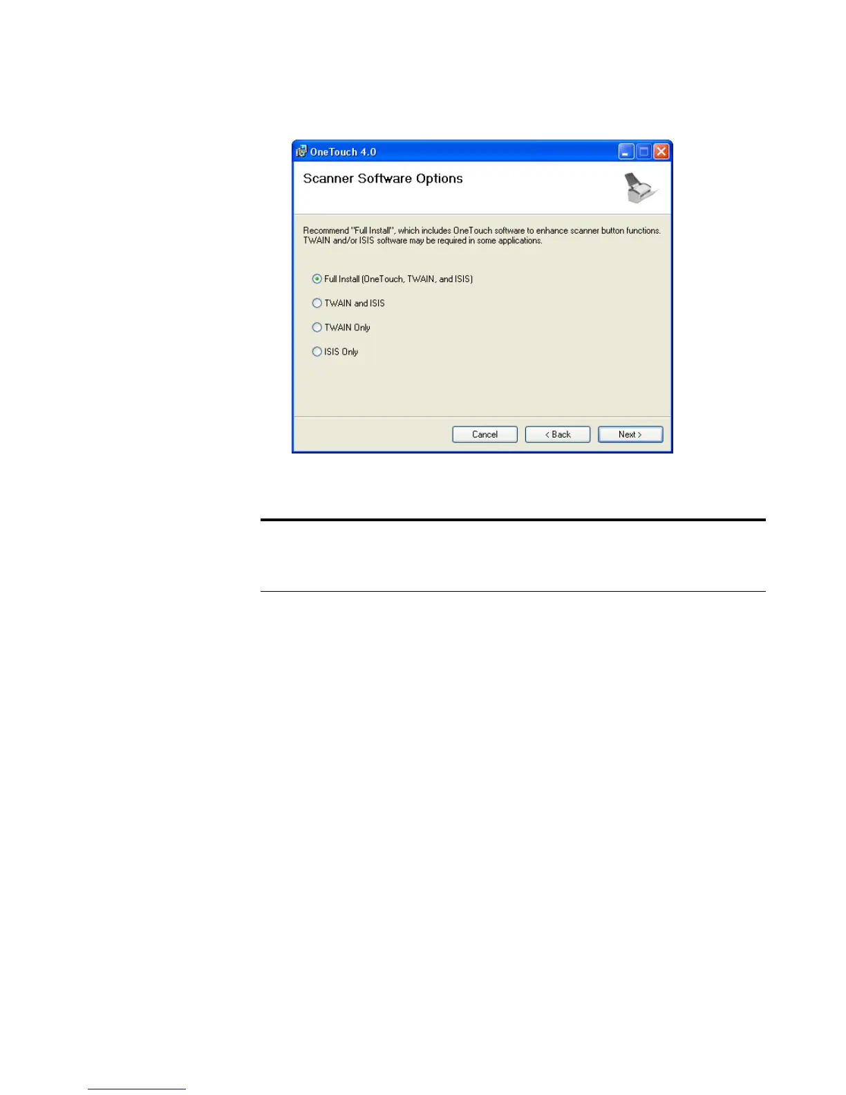 ■ Full Install (OneTouch, TWAIN, and ISIS)—This is the
