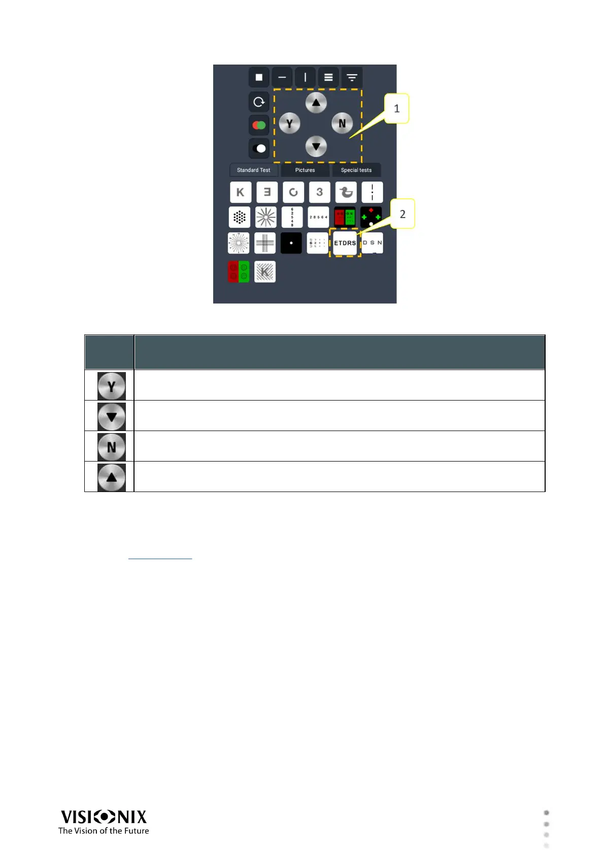 When the Pelli-Robson test is selected (#2 in the illustration below), the system expects you to
