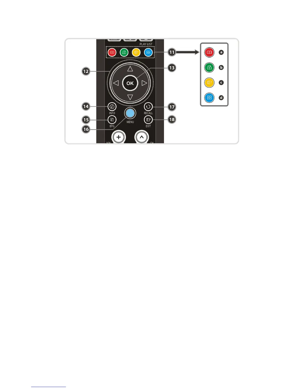 13. OK or Service List : Show the service list in non-menu mode and select an item or confirm