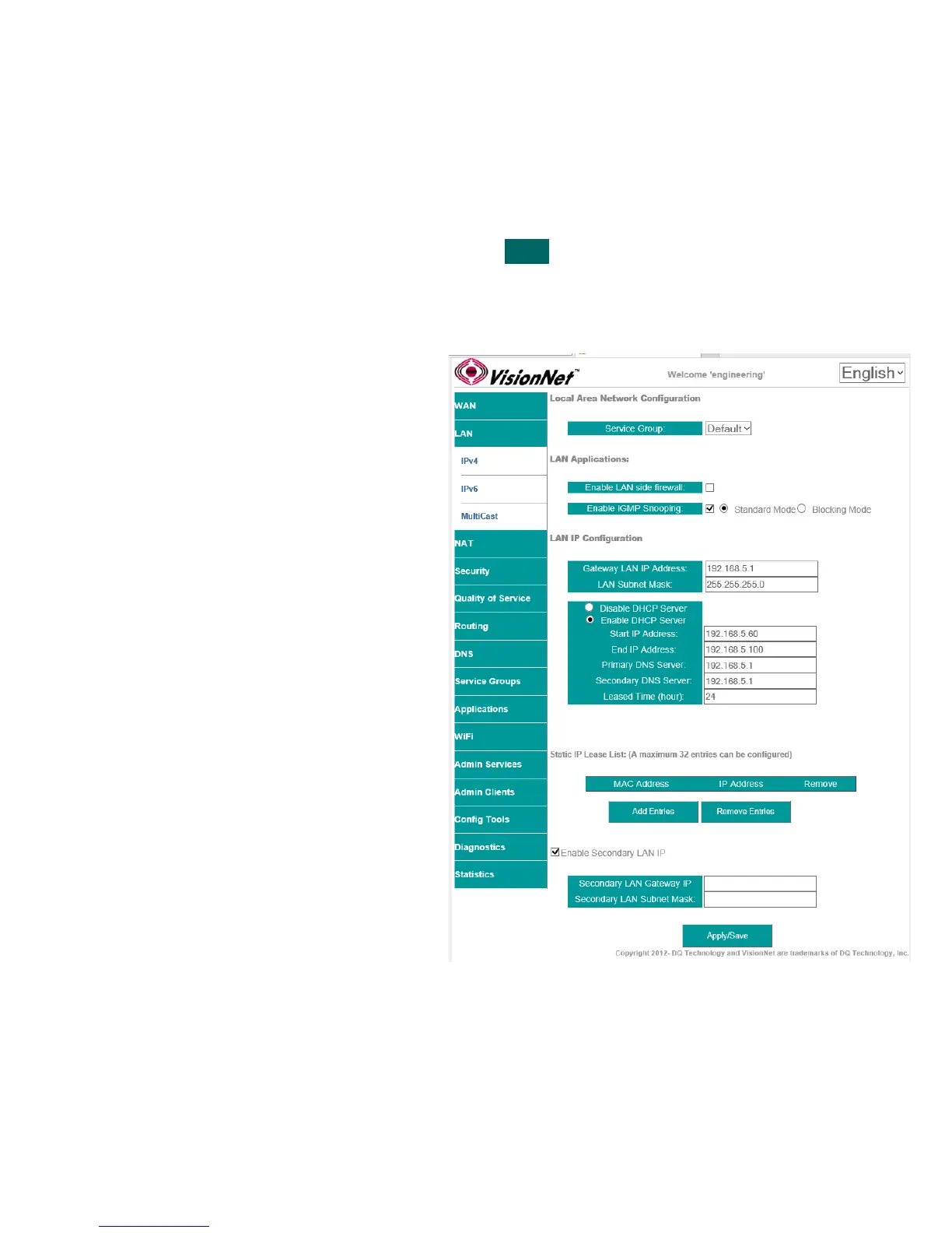 This section will depict the configuration of LAN broadcast groups. Each service group has separate IP, broadcast, and multi-