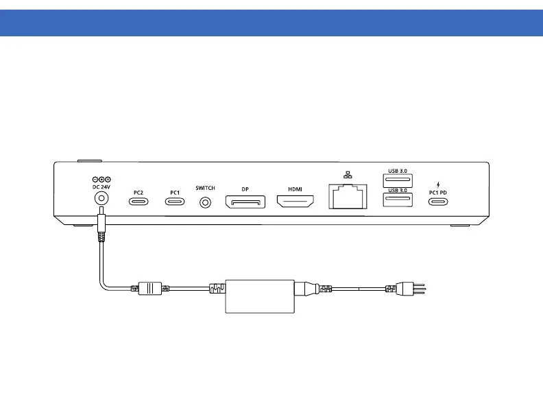 1. Plug the power adapter into the DC In port on the back of the dock. Connect the other end into