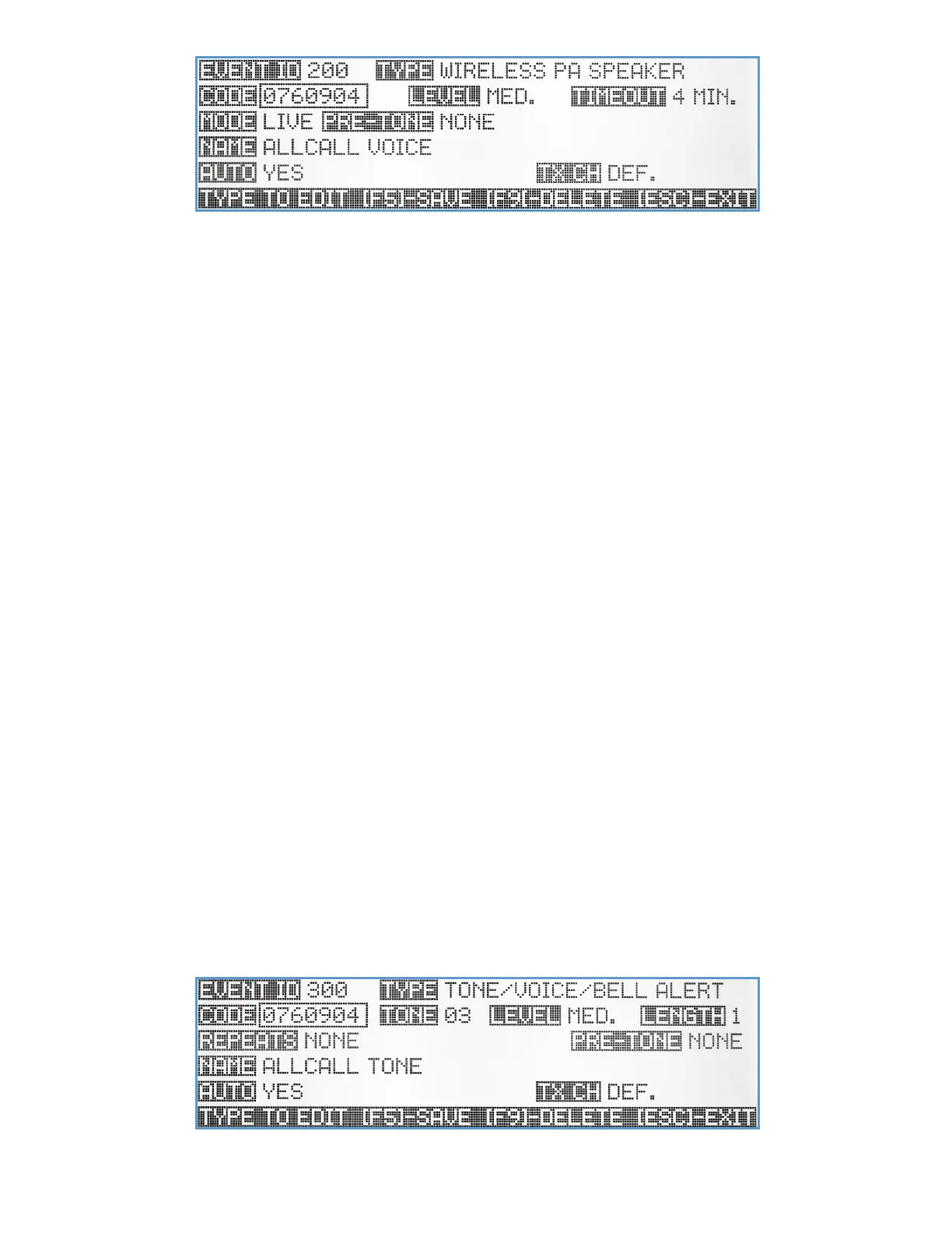 Level – Setup the PA speaker audio level for this event. Use the Up/Down arrow keys to select one of four audio levels: