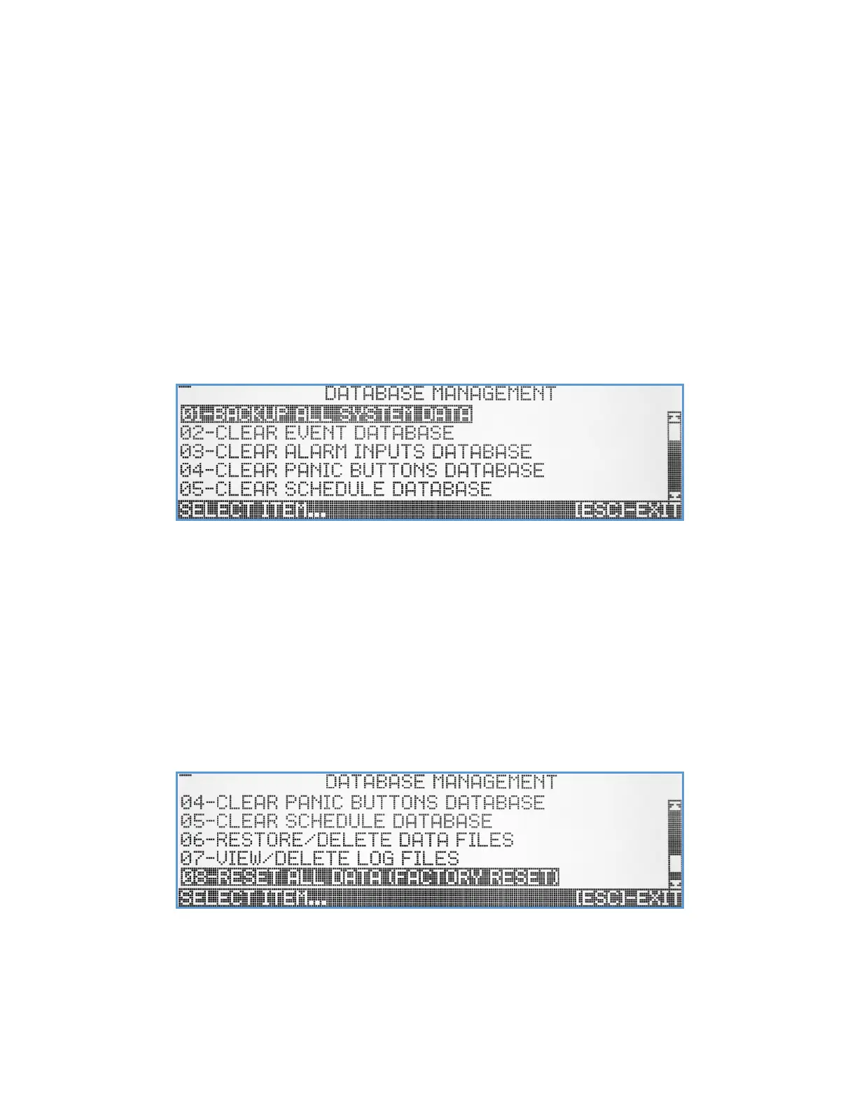 system configuration, and activity log files. Selecting this submenu will bring up the Database Management screen.