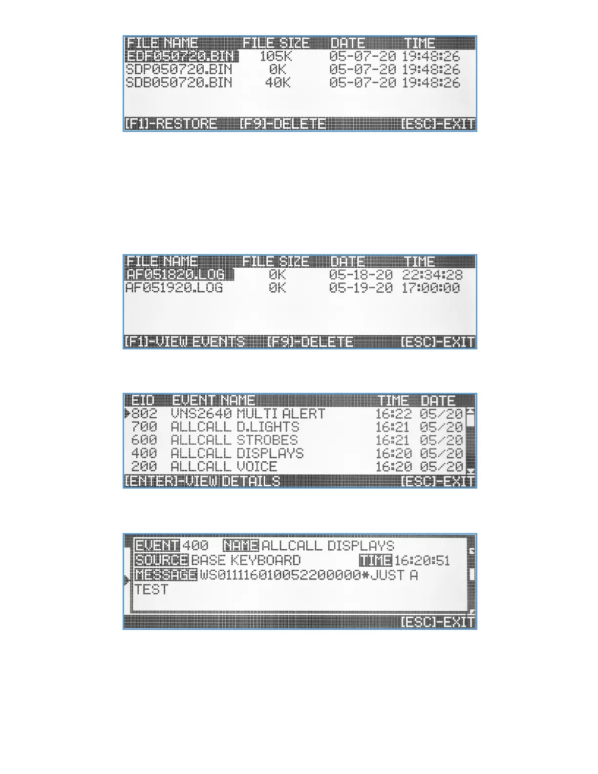 log file on the list. Use the [F1] key to view the log file content and a list of all VS4820 activity for that day.
