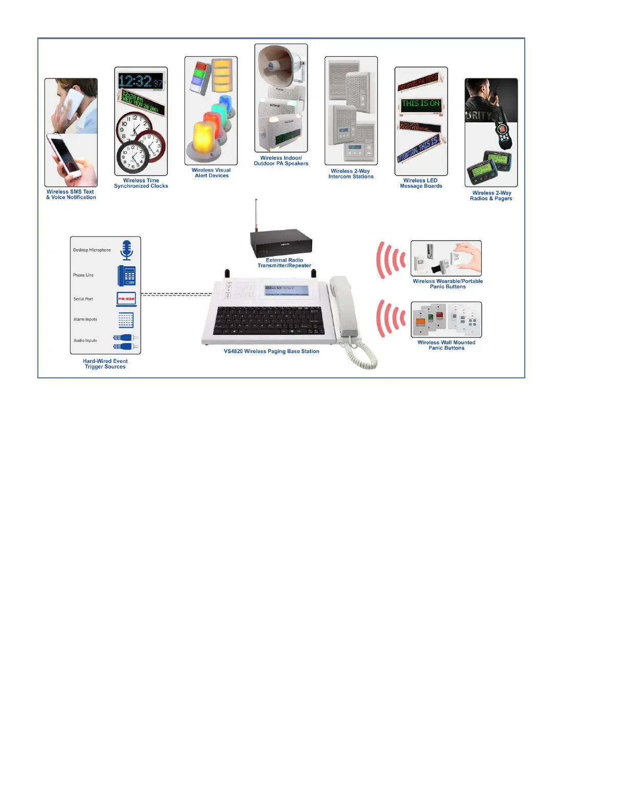 Visiplex wireless products, such as: wireless PA speakers, intercom stations, LED message boards, visual alerts, clocks