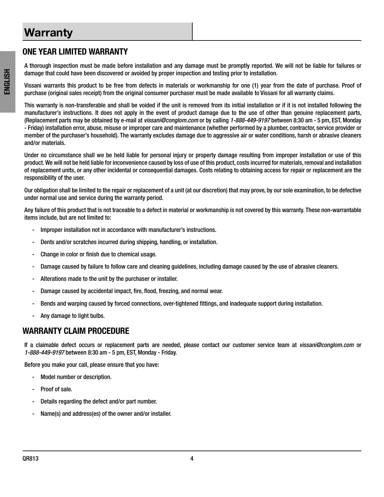 If a claimable defect occurs or replacement parts are needed, please contact our customer service team at vissani@conglom.com or