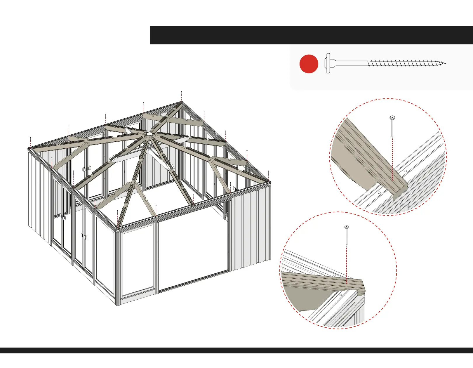 1) Fasten the Common, Hip and Jack Rafters to the Truss Frame as shown.