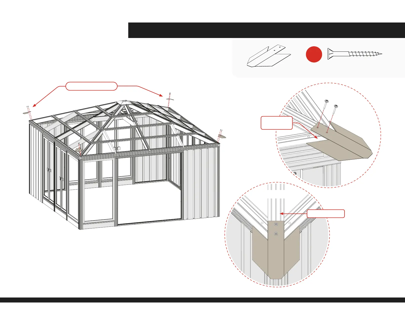 2) Fasten the screws in the pre-drilled holes to the Hip Rafters.