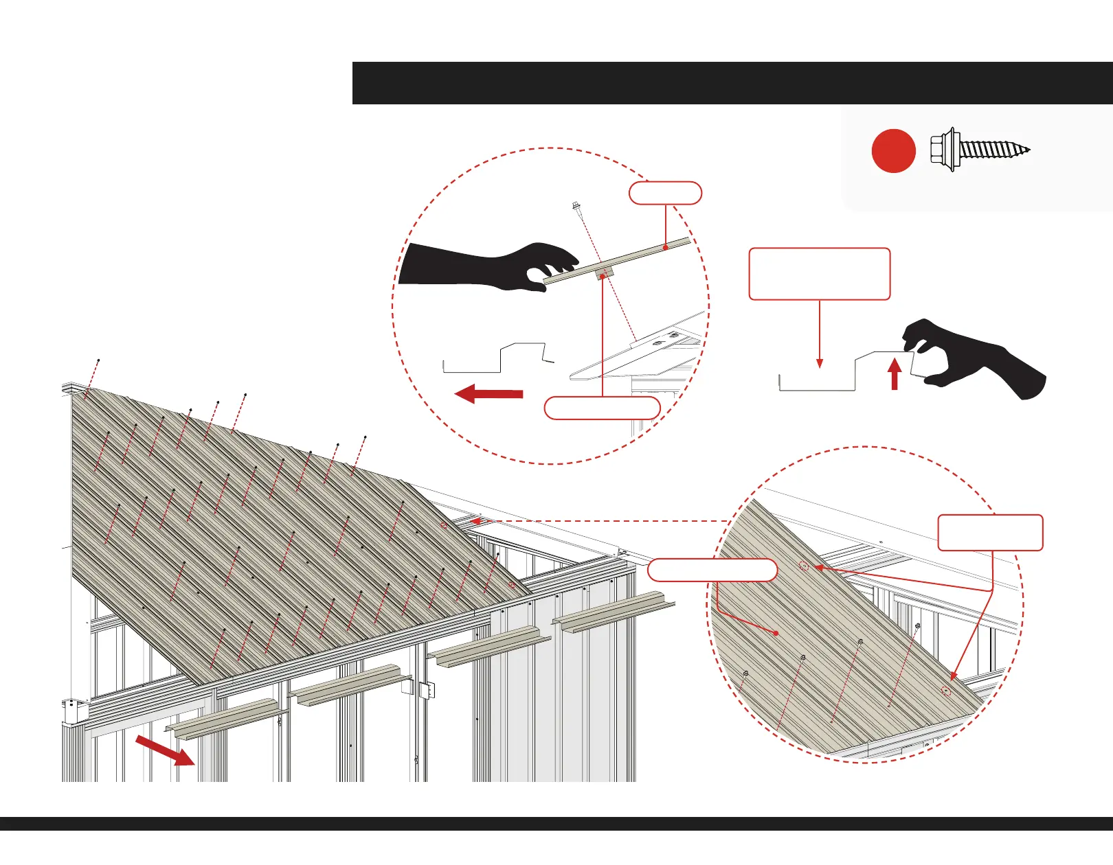 2) Fasten the remaining screws of the Roof Sheets, with exception of