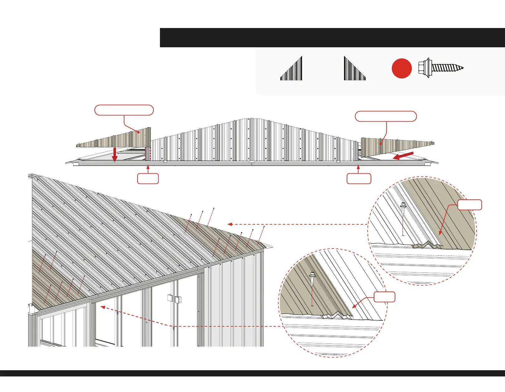 1) Place Roof Sheet (Outside left) (DC 7041) on the Roof strapping, overlap one rib as shown.