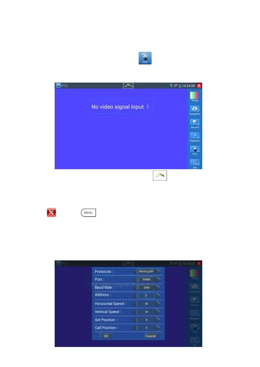 “Snapshot” , “Record” , “Playback” , “PTZ” , “Set” ,