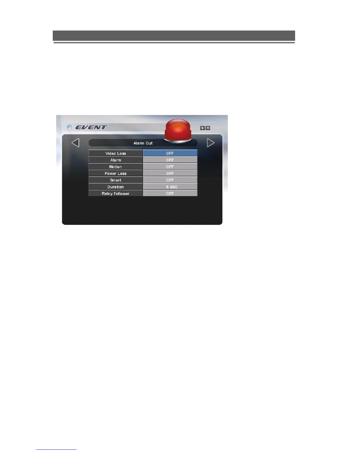 The Alarm out relay can be set to activate on the following occurrences: Video Loss;