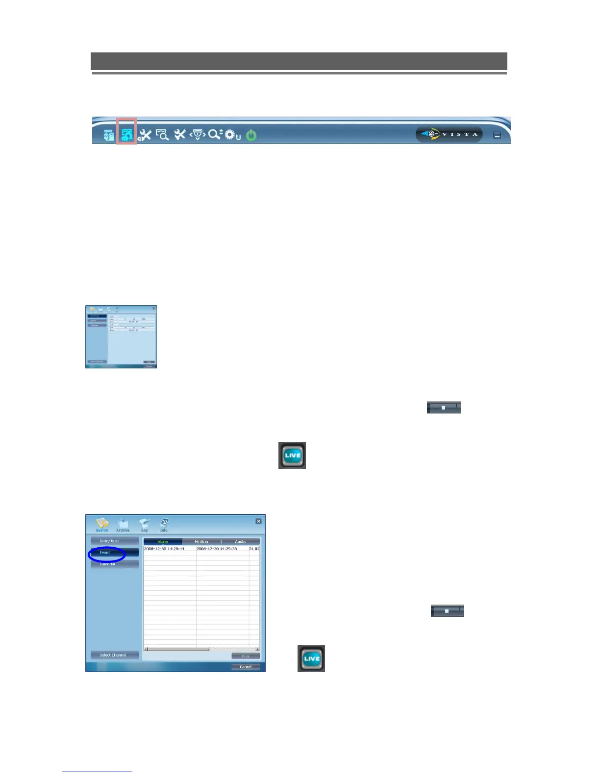 Search (Date/Time/Event/Calendar), Archive (Remote Archive), Log (Remote Log) are