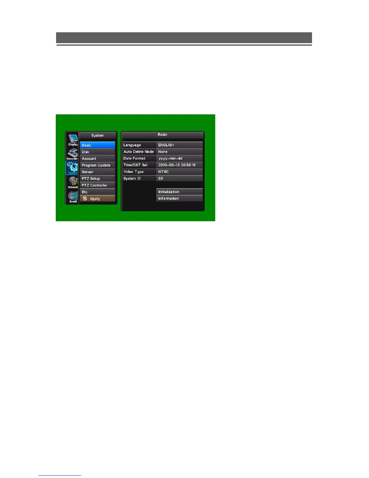 User can set Language, Auto Delete Mode, Date Format, Time/DST Set, Video Type, System