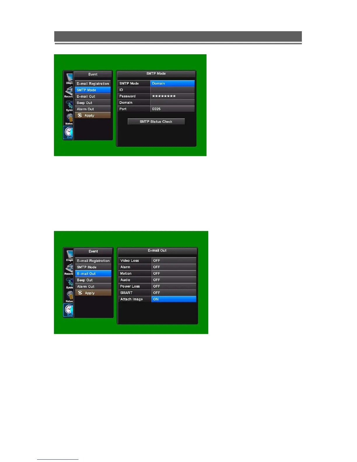 following occurrences: Video Loss; Alarm; Motion: Power Loss and Smart (Hard disk