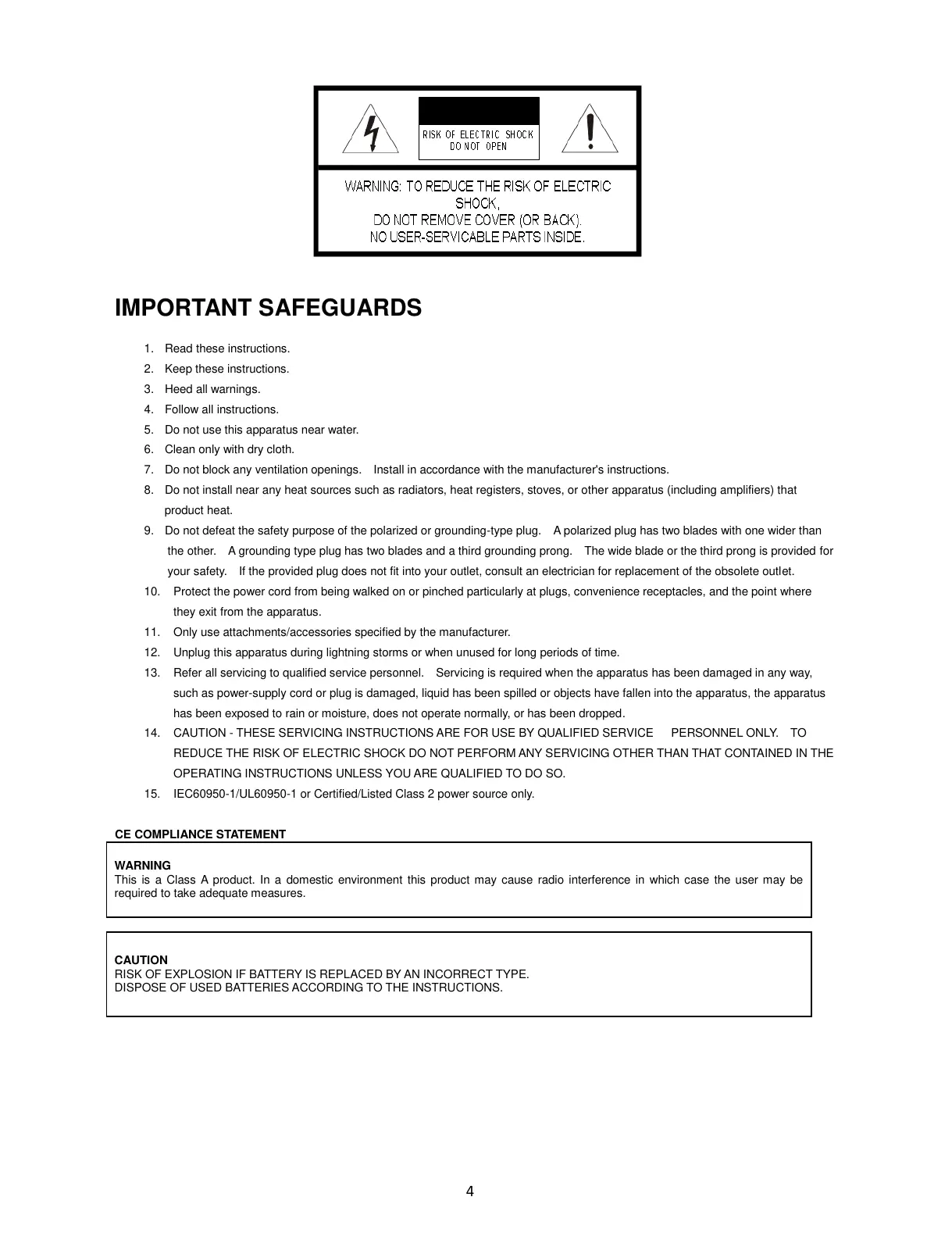 13. Refer all servicing to qualified service personnel. Servicing is required when the apparatus has been damaged in any way,