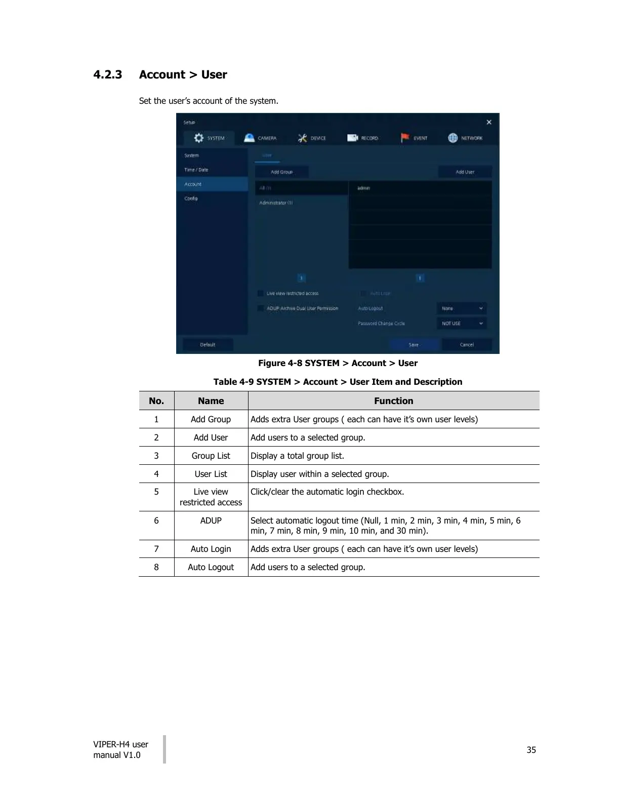 Table 4-9 SYSTEM > Account > User Item and Description