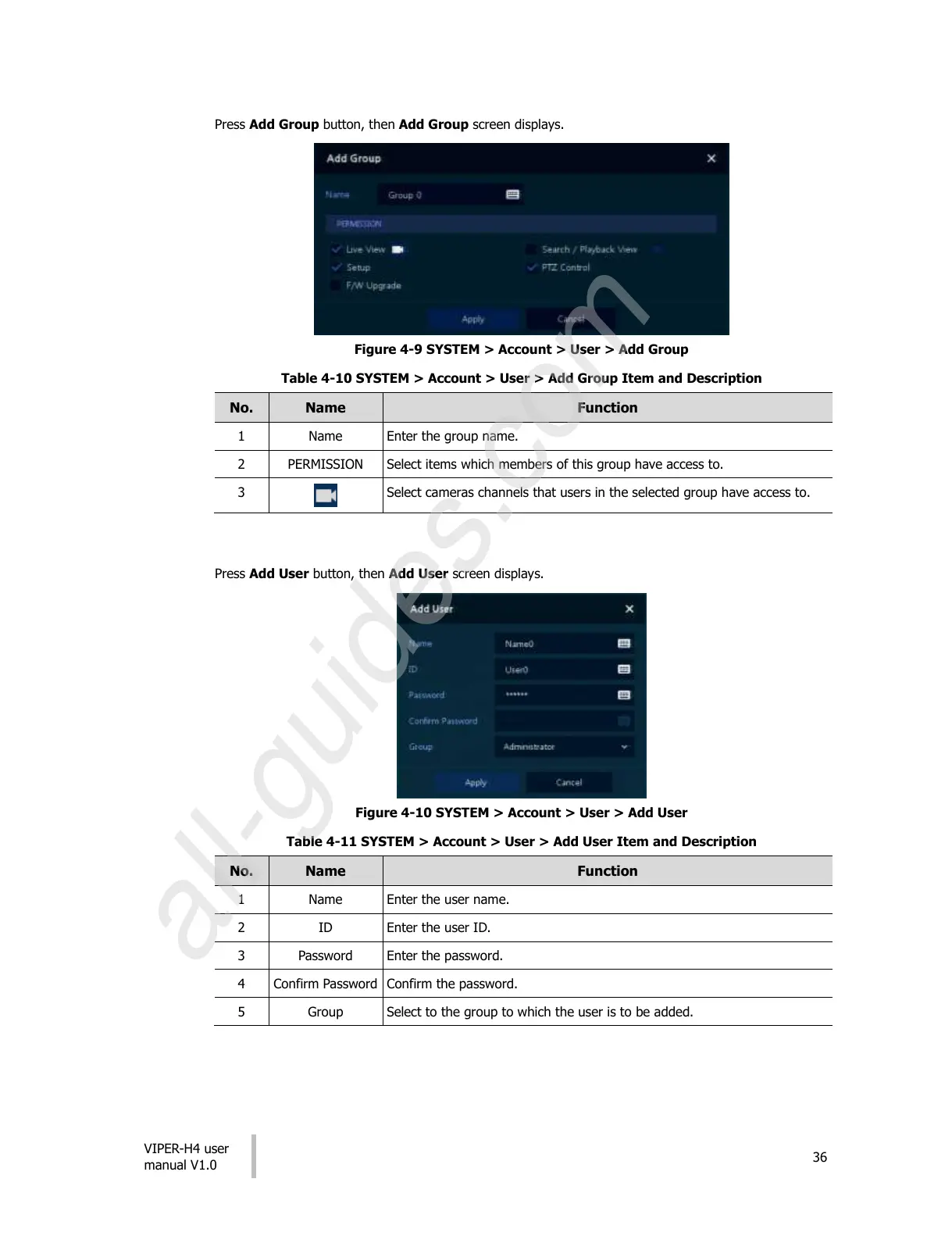 Table 4-10 SYSTEM > Account > User > Add Group Item and Description