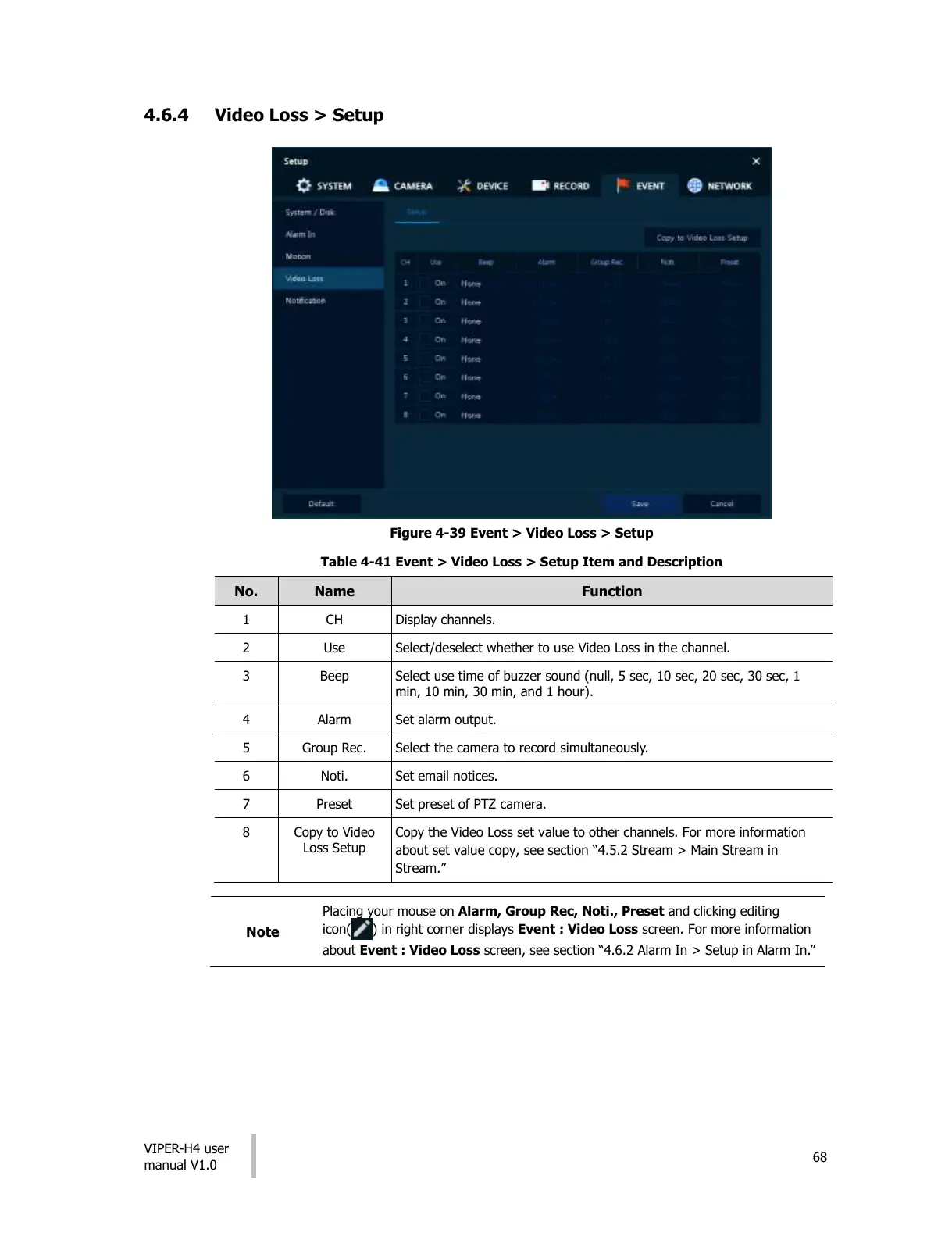 about Event : Video Loss screen, see section “4.6.2 Alarm In > Setup in Alarm In.”