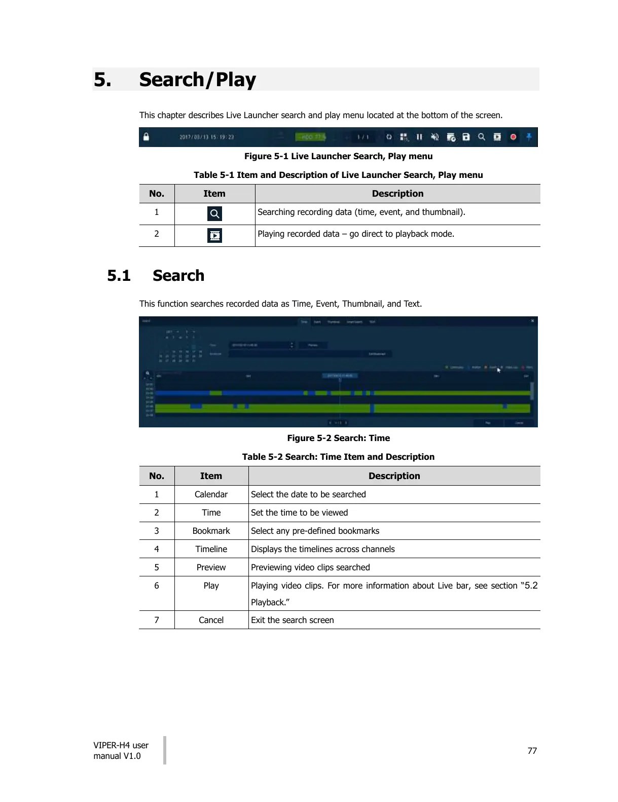 Table 5-1 Item and Description of Live Launcher Search, Play menu