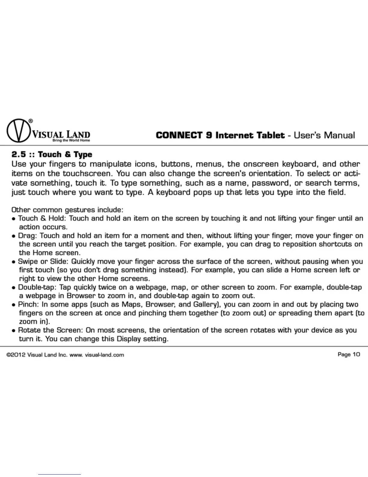 Visual Land Connect 9 - Touchscreen Gestures and Typing