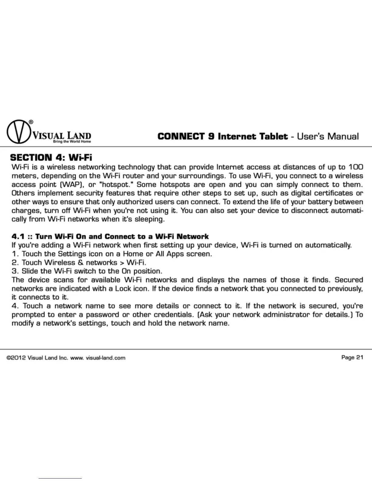 Visual Land Connect 9 - Connecting to Wi-Fi Networks; Enabling and Connecting to Wi-Fi