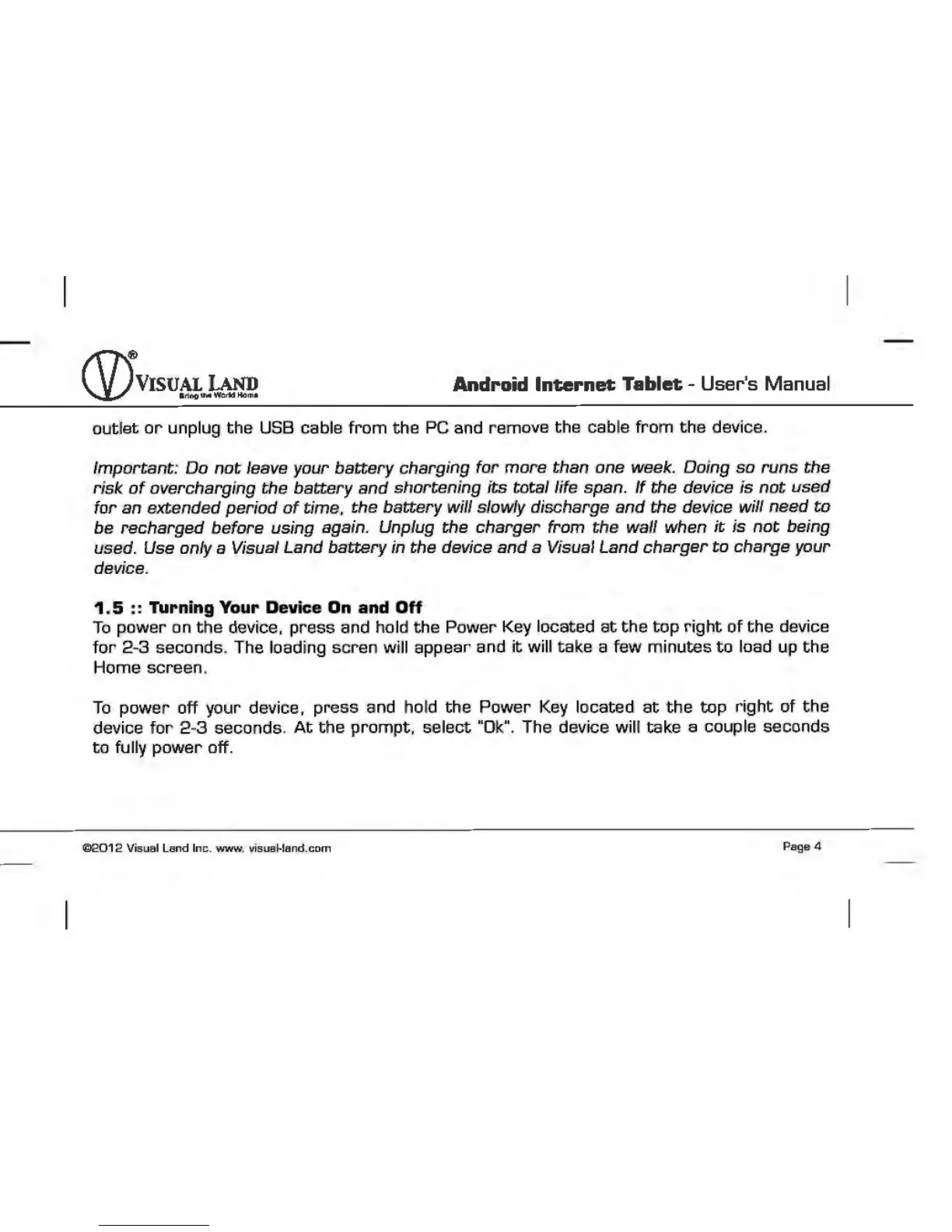 Visual Land Prestige 7 - Turning Your Device On and Off
