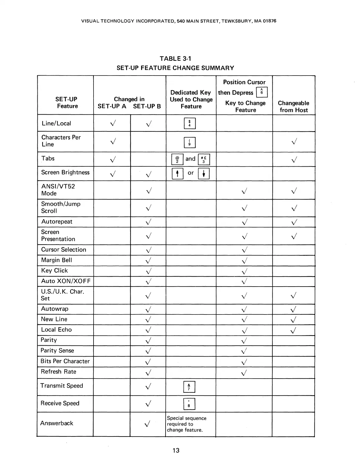 VISUAL 100 - Table 3-1 SET-UP Feature Change Summary