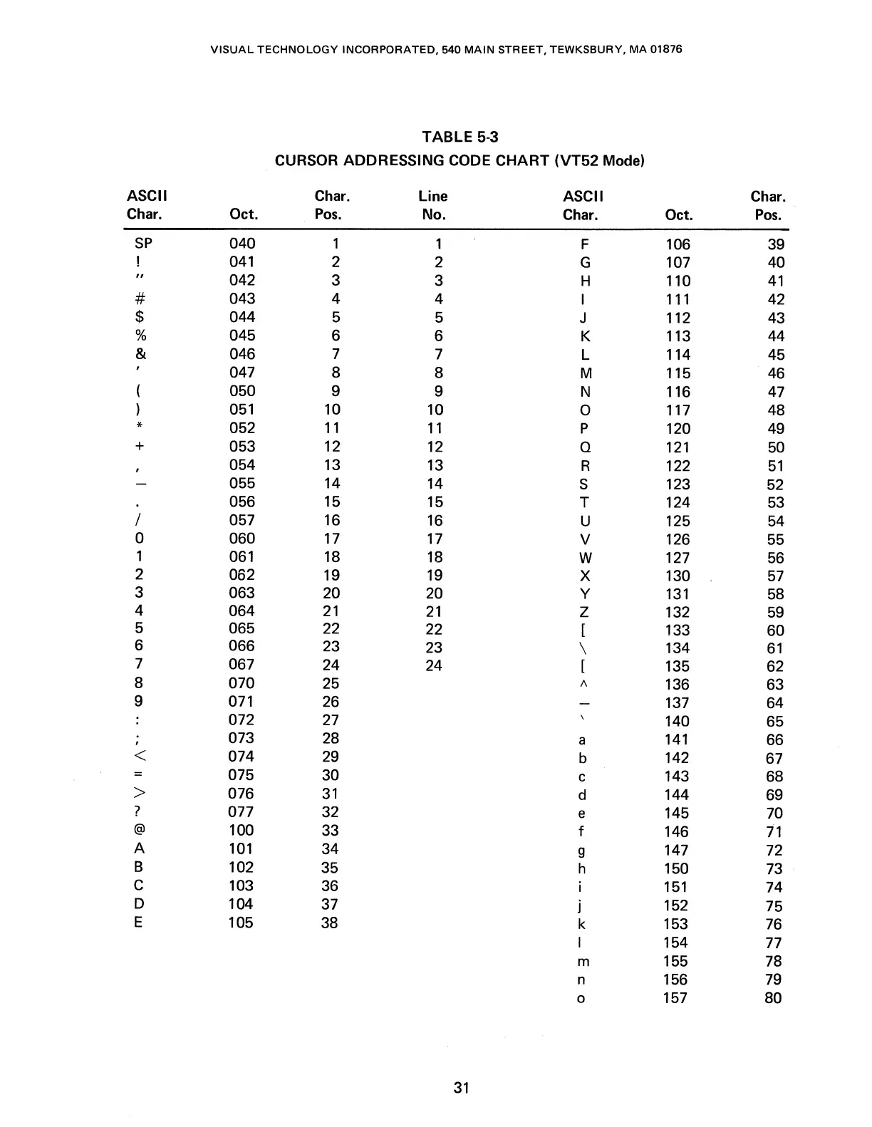 VISUAL 100 - Table 5-3 Cursor Addressing Code Chart (VT52 Mode)