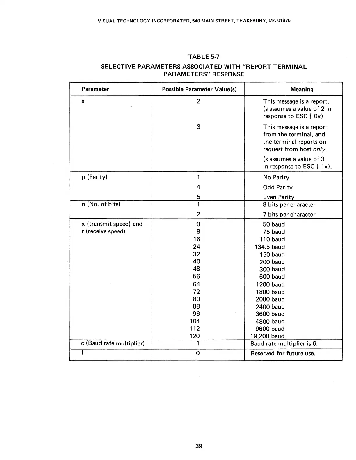 VISUAL 100 - Table 5-7 Selective Parameters Associated with Report Terminal Parameters Response