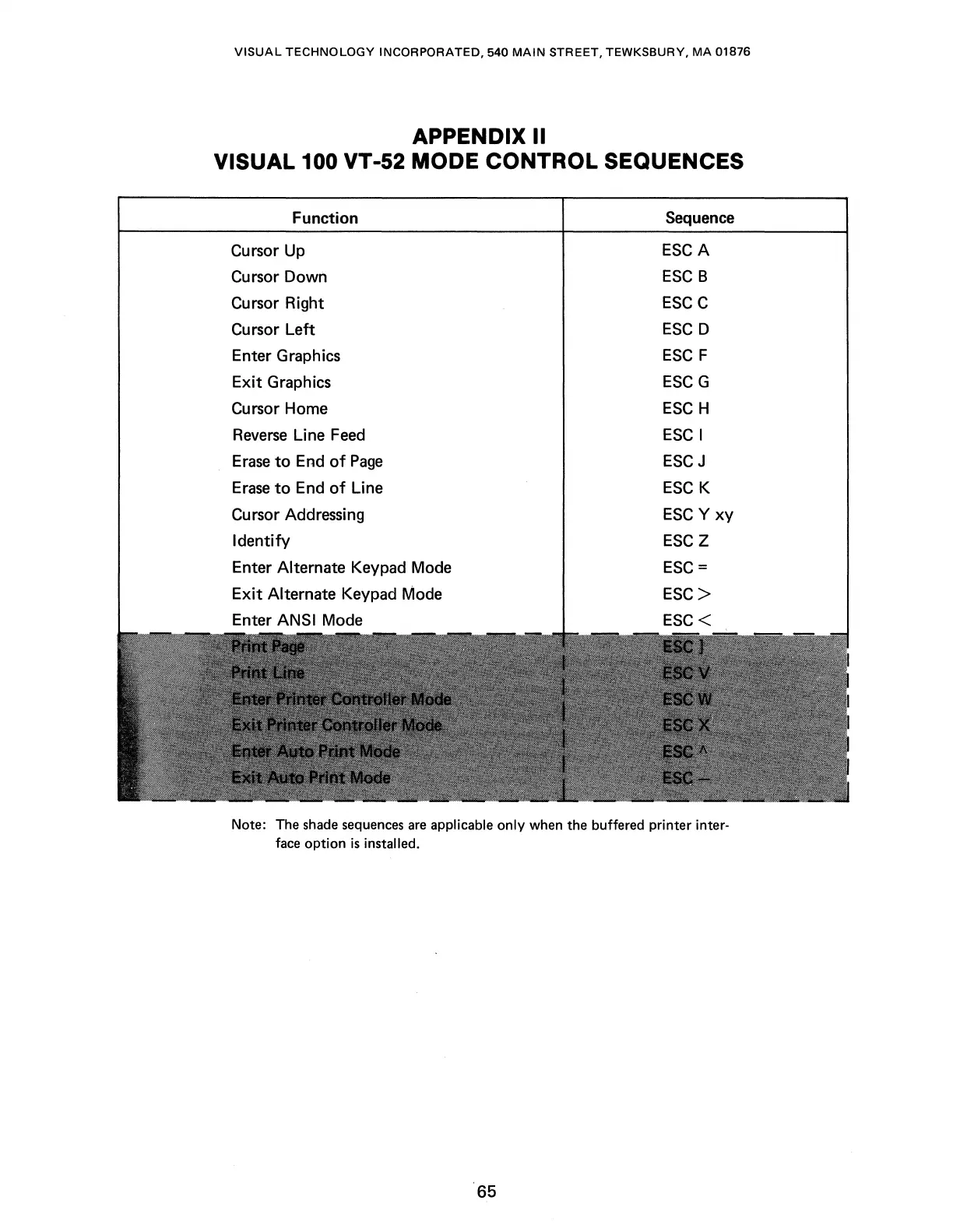 VISUAL 100 - Appendix II -Visual 100 Vt-52 Mode Control Sequences