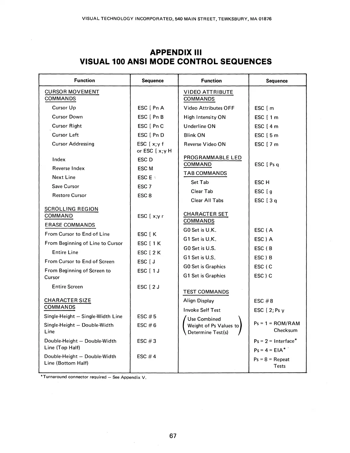 VISUAL 100 - APPENDIX Ill -VISUAL 100 ANSI MODE CONTROL SEQUENCES