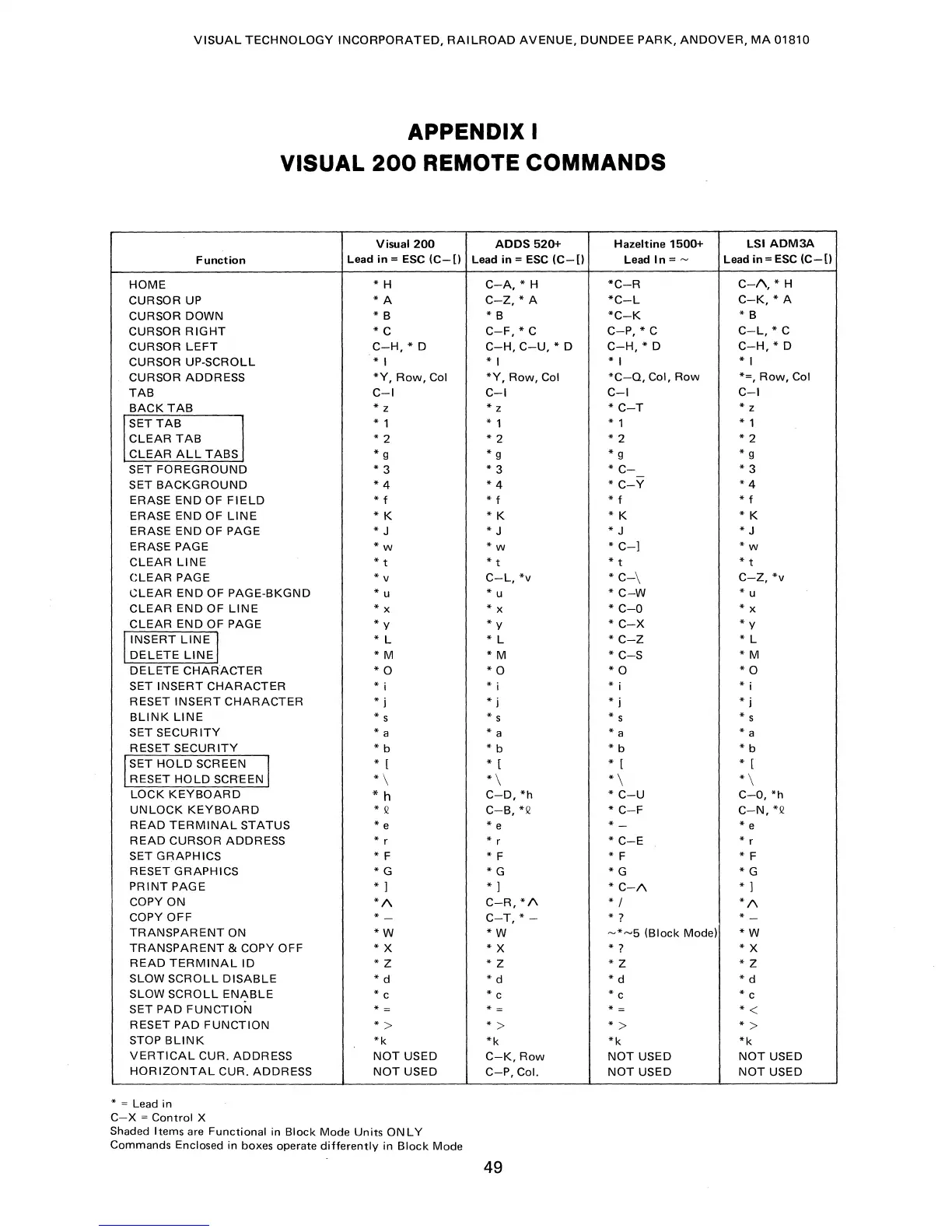 VISUAL 200 - APPENDIX I - VISUAL 200 REMOTE COMMANDS