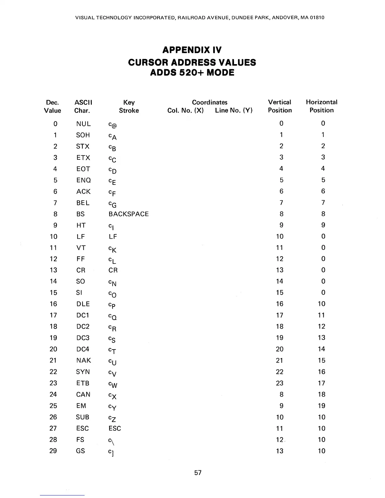 VISUAL 200 - Appendix IV - Cursor Address Values Adds 520+ Mode