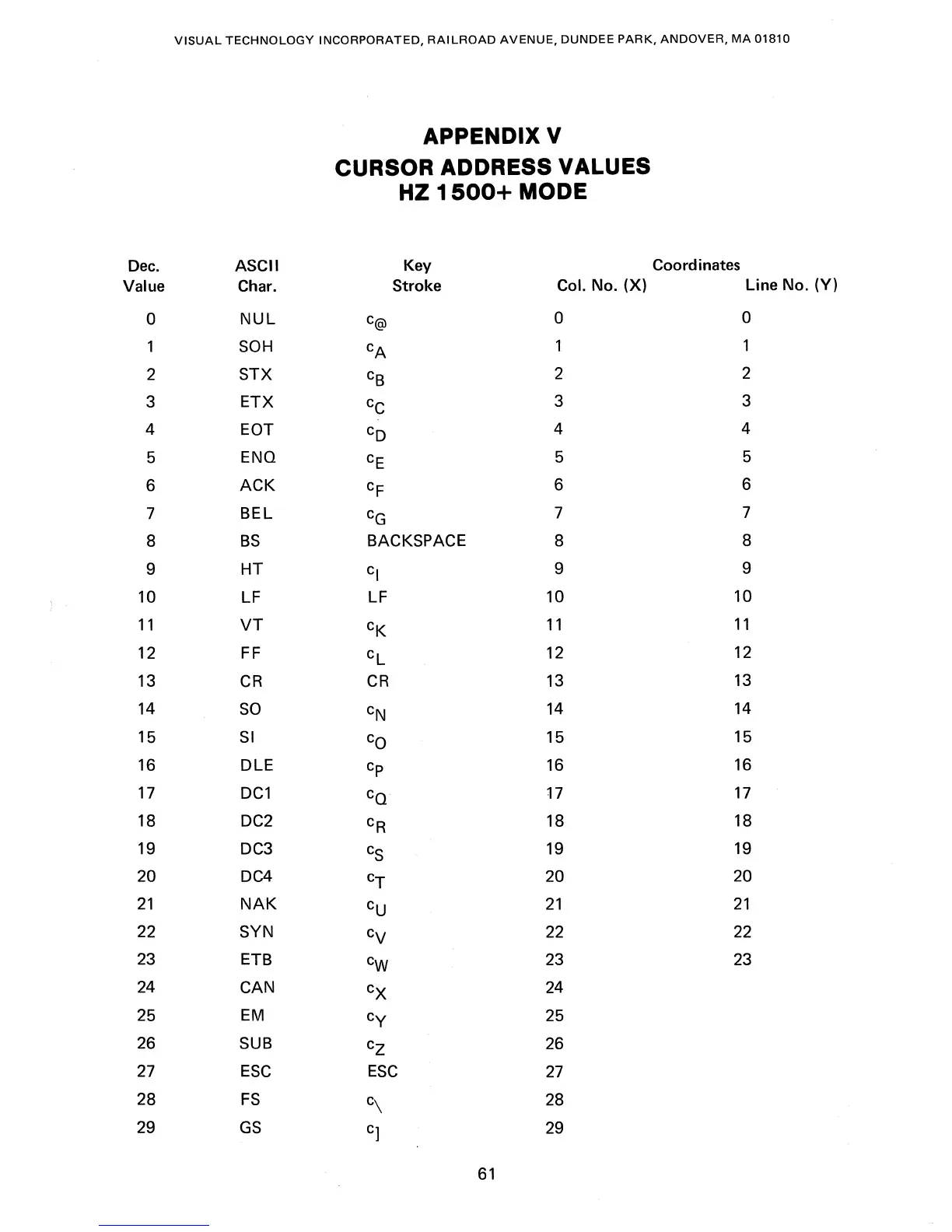 VISUAL 200 - Appendix V - Cursor Address Values Hz 1500+ Mode